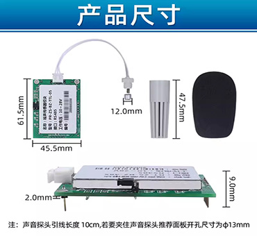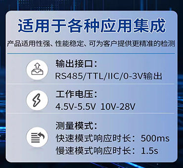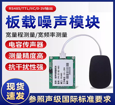 PCB板載安裝方式,30~130dBA寬量程、20~12.5KHz寬頻率測(cè)量,輸出接口TTL或RS-485出廠可選,供電電源4.5V~5.5VDC、10~28VDC可選。